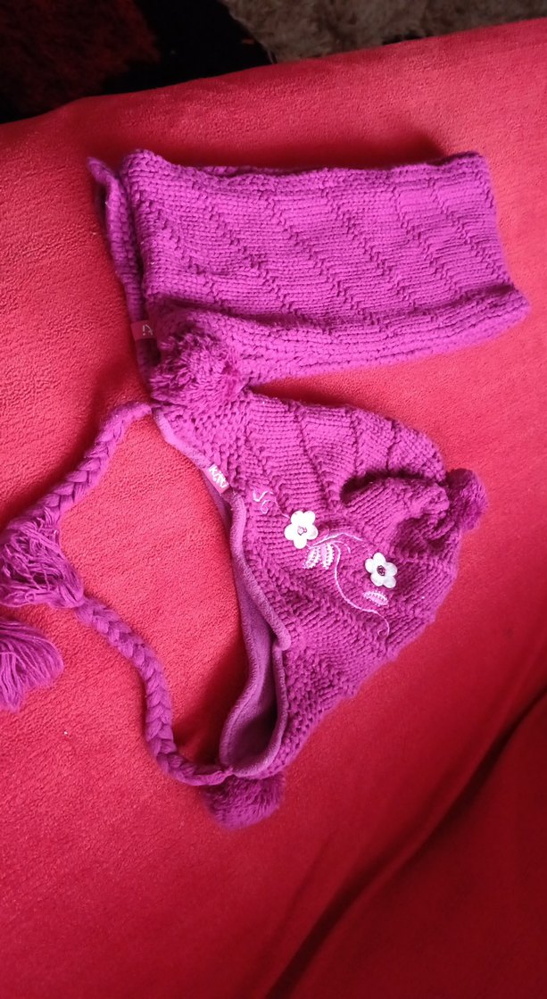 Renkli pembe örgü çocuk bere, nakışlı çiçek desenleri ve örgülü püsküllerle, eşleşen atkı ile birlikte. Bohem tarz için uygun.