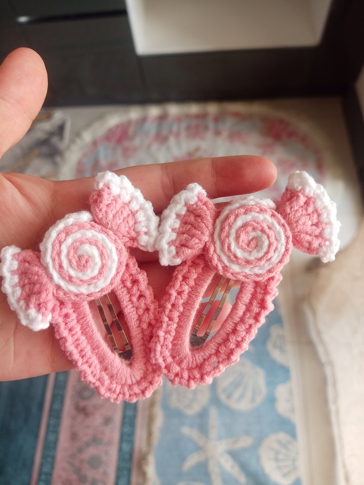 Renkli pembe örgü tasarımlı, nakışlı detaylara sahip çocuk tokaları, bohem tarzı için uygun.