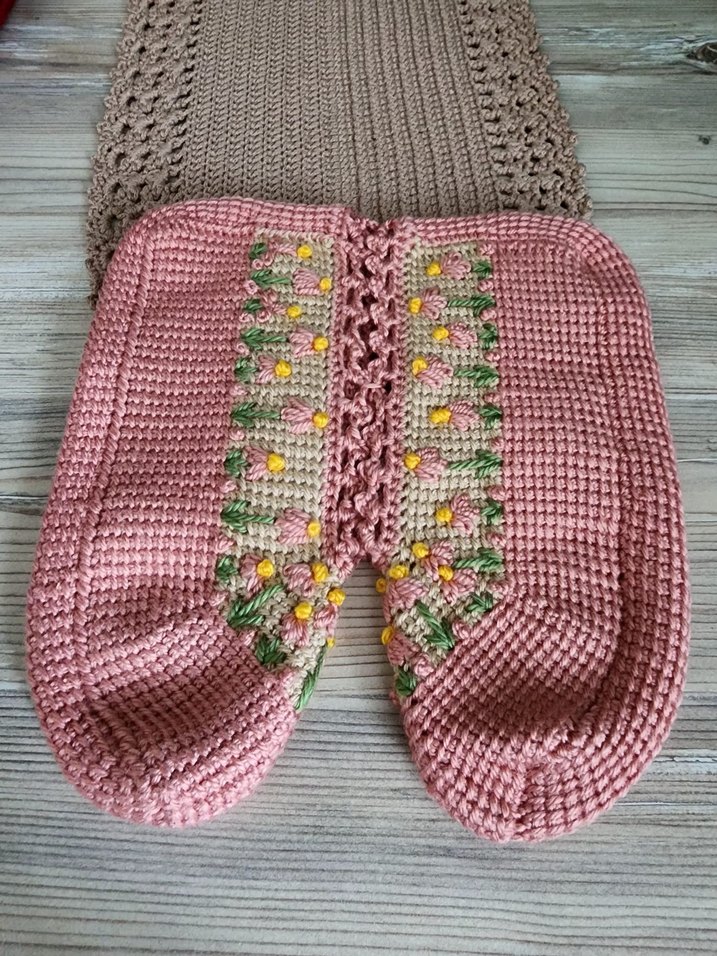 Nakışlı çiçek detaylı pembe örgü terlikler, rahat ve geleneksel tarzda, günlük kullanım için uygundur.