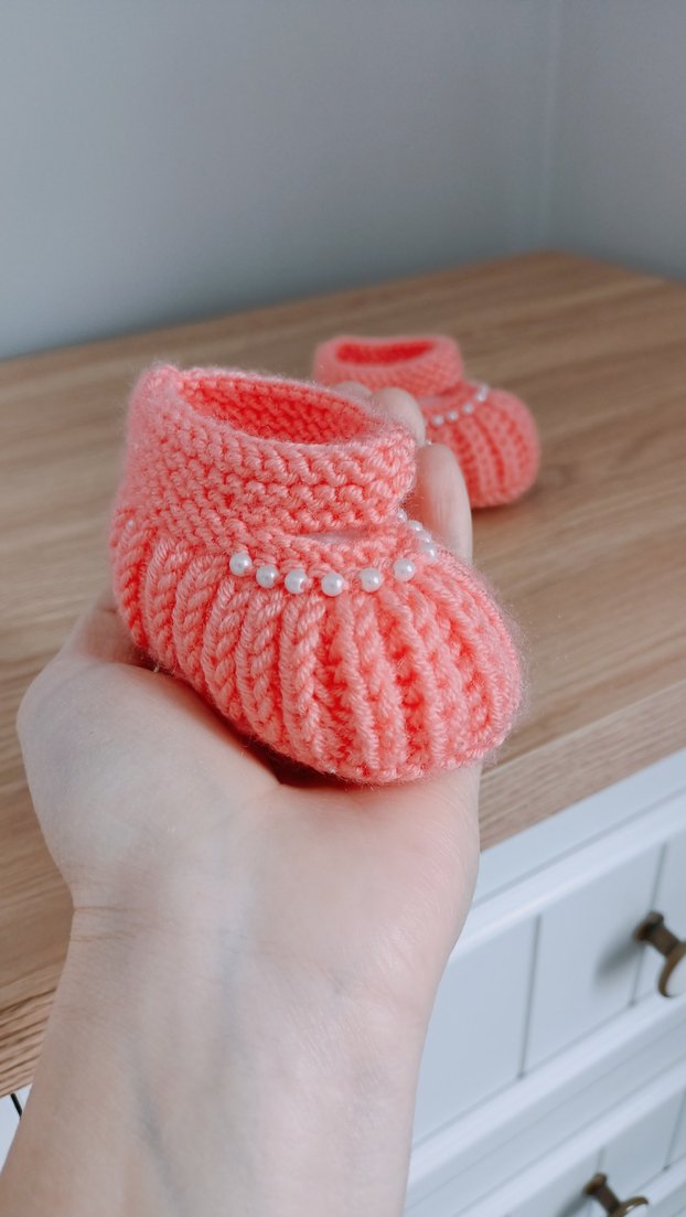 Nakışlı detaylara ve inci süslemeye sahip pembe örgü kız bebek patik, renkli ve klasik bir tarz sunar.