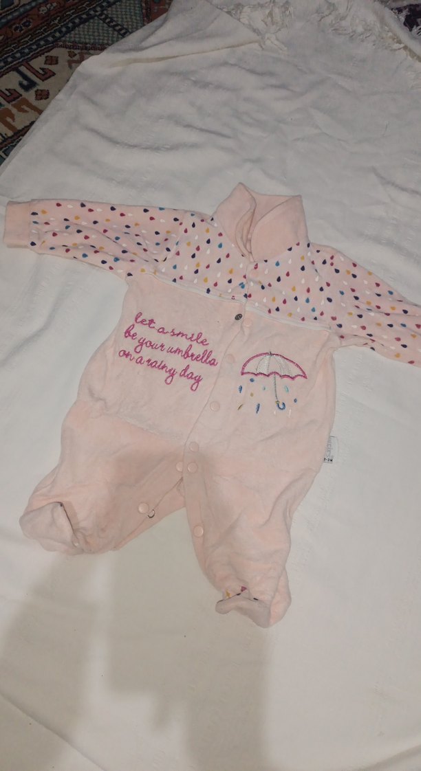 Pastel pembe renkli, örgü kumaştan yapılmış kız bebek tulumu. Nakışlı renkli yağmur damlaları ve şemsiye detayları bulunur. Kolay giydirme için çıtçıtlıdır. ☂️