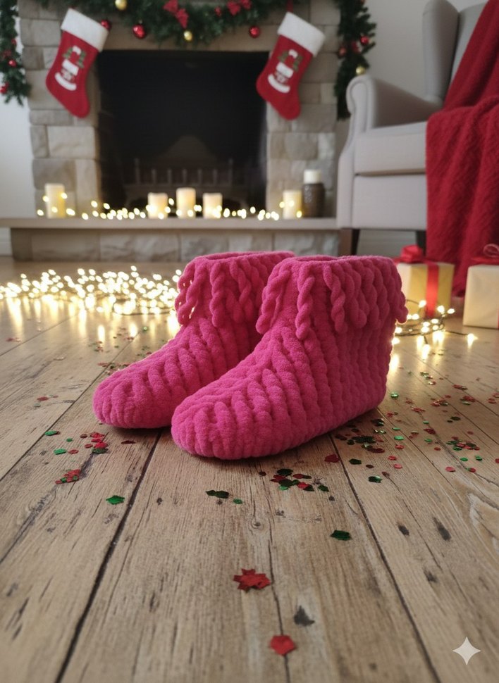 Renkli pembe örgü kız ev terliği, nakışlı detaylara sahip ve bohem tarzıyla sıcaklık sağlar.