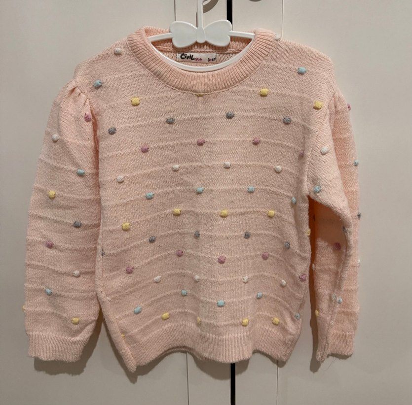 Pembe pastel renkte, nakışlı puanlı desenli, yuvarlak yaka ve uzun kollu, bol kesim kız örgü kazak. 3-4 yaş