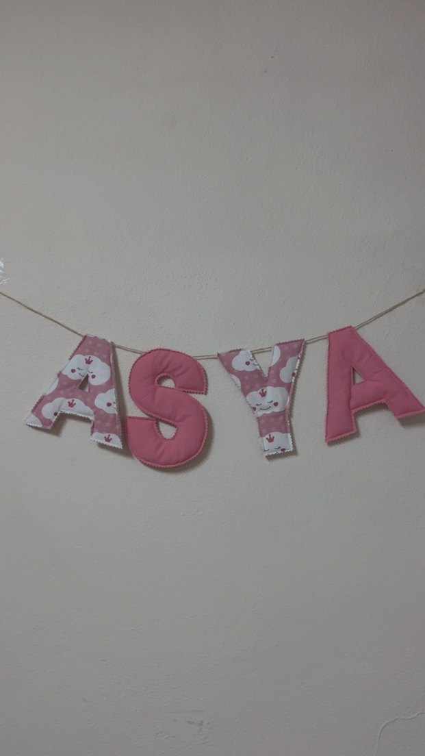 Nakışlı harflerden oluşan, pamuklu yumuşak kumaştan yapılmış pastel pembe çocuk duvar süsü, ASYA ismini oluşturur.
