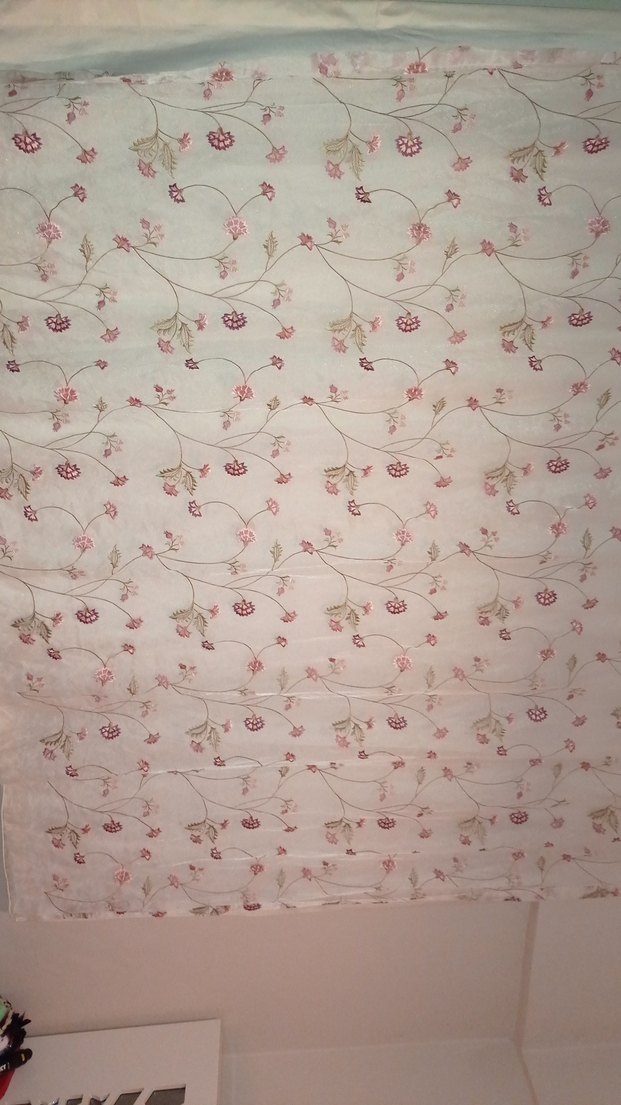 Nakışlı pembe çiçek desenleriyle pastel renkte, klasik tarzda tül perde, mekâna zarif ve yumuşak bir hava katıyor.