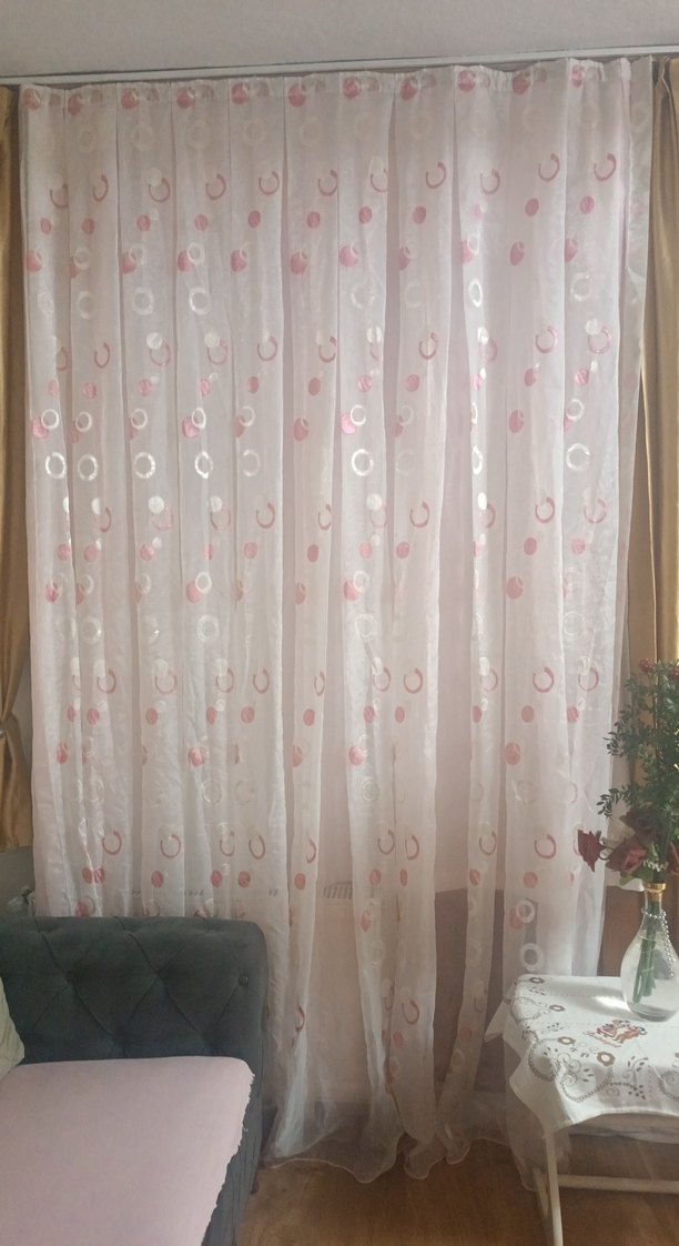 Nakışlı pembe pastel renkte, sade ve şeffaf tül perde, mekâna hafif ve zarif bir hava katıyor.