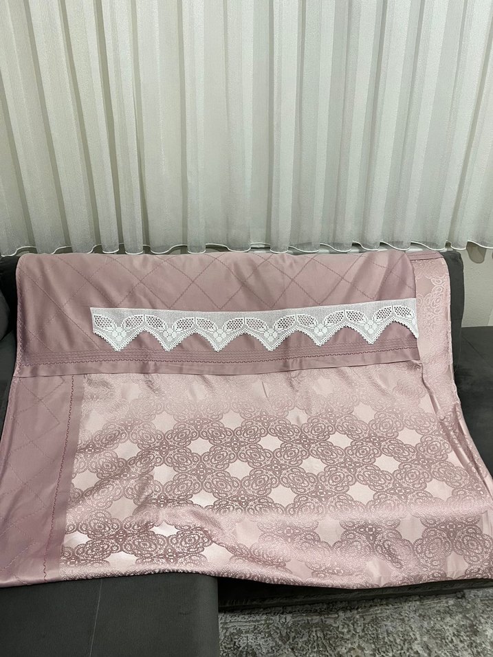 Nakışlı desenlere ve dekoratif dantel detayına sahip pastel pembe yatak örtüsü. Yumuşak ve şık tasarım, yatak odası için uygundur. ️ Çeyiz için yapılmış ama hiç kullanılmamıştır. Satendir. 2 yastık bir büyük çarşafı yatak örtüsü mevcuttur.