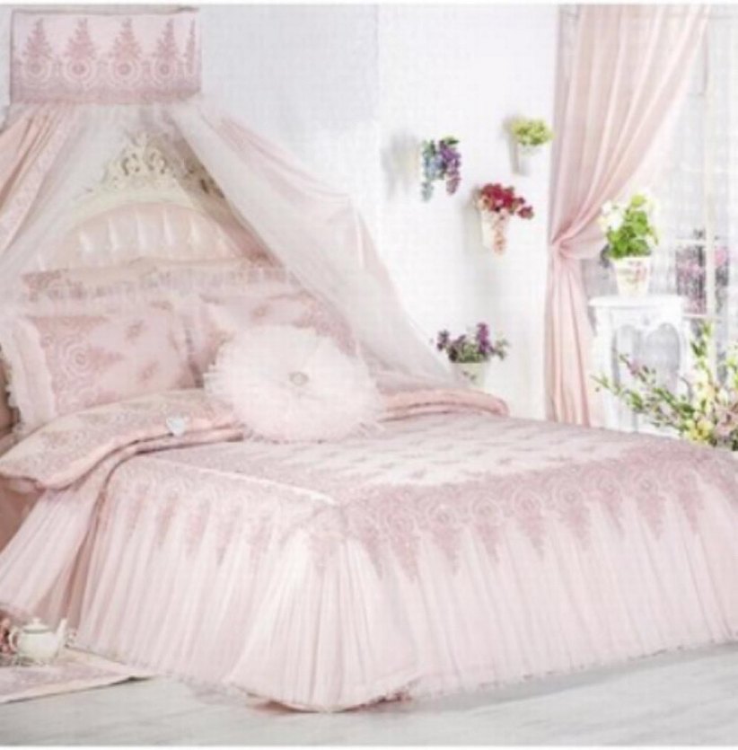 Nakışlı detaylara sahip pastel pembe yatak örtüsü, yatak odasına zarif bir dokunuş katar. 2 adet yastık 1 adet yuvarlak yastık 1 adet örtü