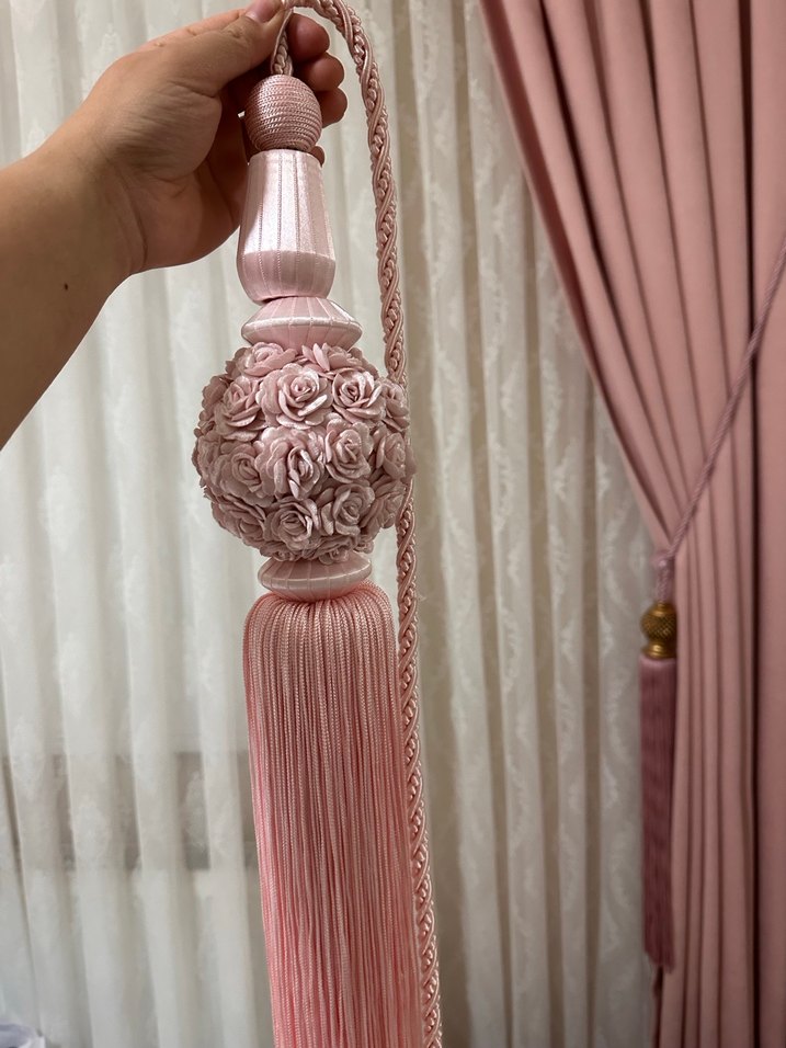 Pembe renkte, nakışlı çiçek detaylı ve uzun püsküllü, klasik pastel perde aksesuarı.
