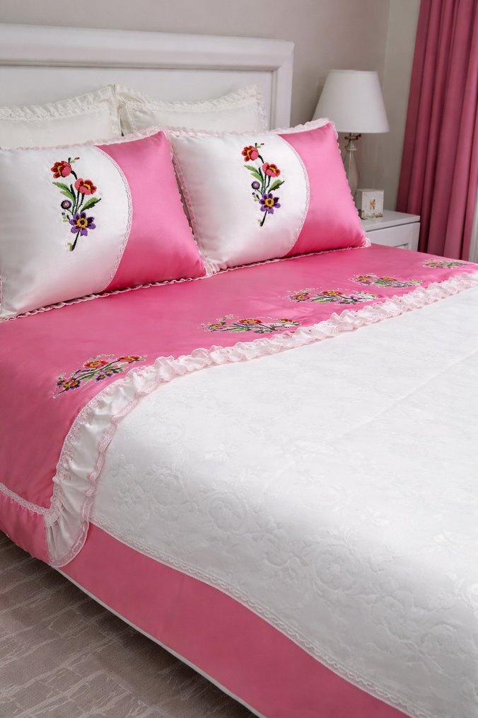 Pastel pembe renkte, nakışlı çiçek desenleri ve dantel detayları bulunan yumuşak kumaşlı pike ve çarşaf takımı.Pembe pike boy 225-190cm carsafi lastikli saten yatak gorselim olmadigi icin ilk gorsel yapay zekayla olusturulmustur cok az farklilik gosterebilir parcalari ekteki gorselde mevcuttur.
