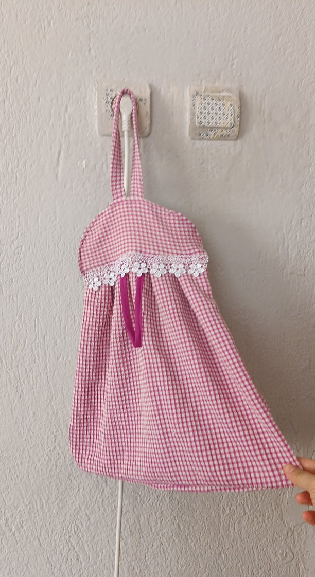Pastel pembe renkte, nakışlı çiçek desenli ve asma yeri ile rahat kullanım. yumuşak kumaştan dikilmiştir. istenilen renkte dikilir.