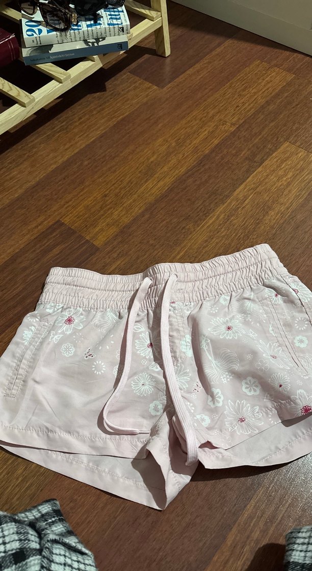 Nakışlı çiçek desenli, düğmeli ve lastikli beli olan pembe rahat kesim şort. Yumuşak sentetik kumaştan, trend sokak giyimi için uygun.
