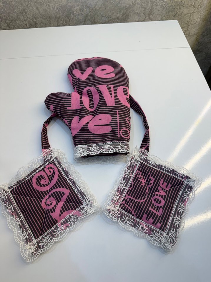 Nakışlı desenlere ve dantel detaylara sahip renkli pembe fırın eldiveni ve tutacak seti, mutfakta şıklık ve koruma sağlar.