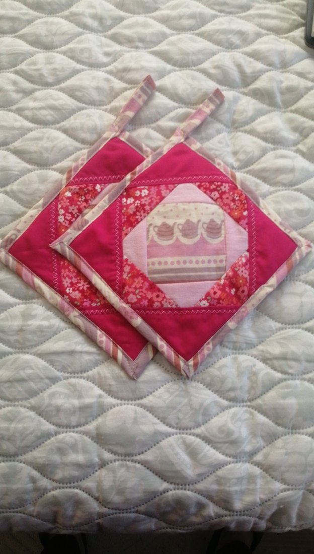 Nakışlı ve renkli desenli, kek motifli pembe renkli iki adet mutfak tutacı. Askı halkalarıyla kolayca asılabilir.