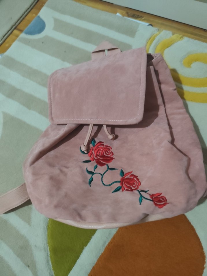 Nakışlı çiçek desenli, tokalı pembe süet sırt çantası, minimal ve sokak stiline uygun günlük kullanım için.