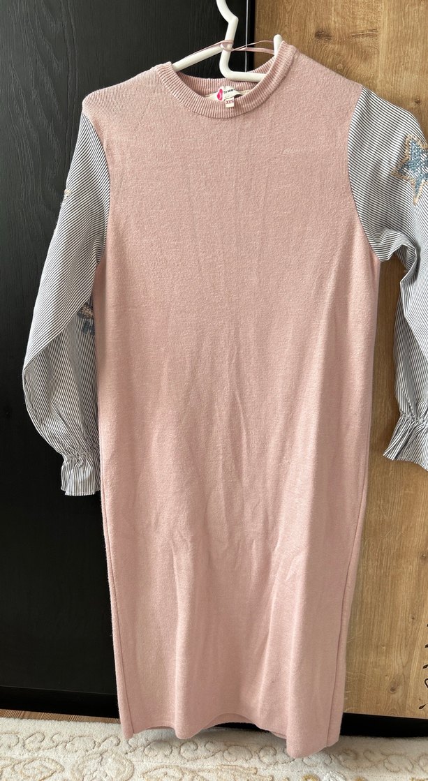 Uzun, bol kesim pembe triko kadın elbise, nakış detaylarıyla dikkat çeker. Uzun çizgili kollarda nakış bulunur, yuvarlak yakalı ve yumuşak sentetik kumaştan yapılmıştır. Rahat gündelik kullanım için uygundur.