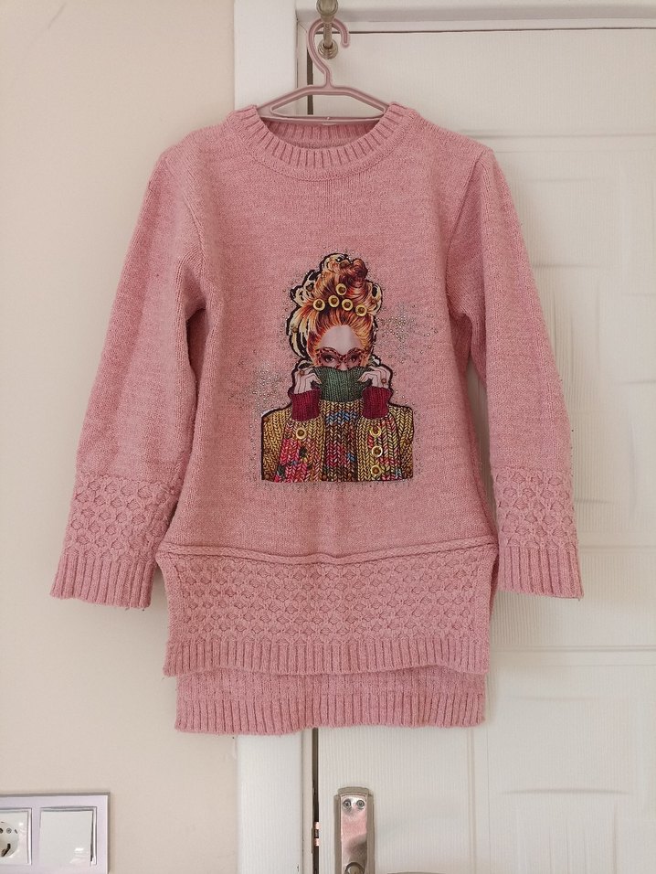 Pembe renkte, uzun kollu ve yuvarlak yakalı bu triko kazak, renkli nakış detaylarıyla bohem tarzı yansıtır. Bol kesim ve midi boydadır, günlük kullanıma uygundur. 12-13 yaşlık az kullanıldı
