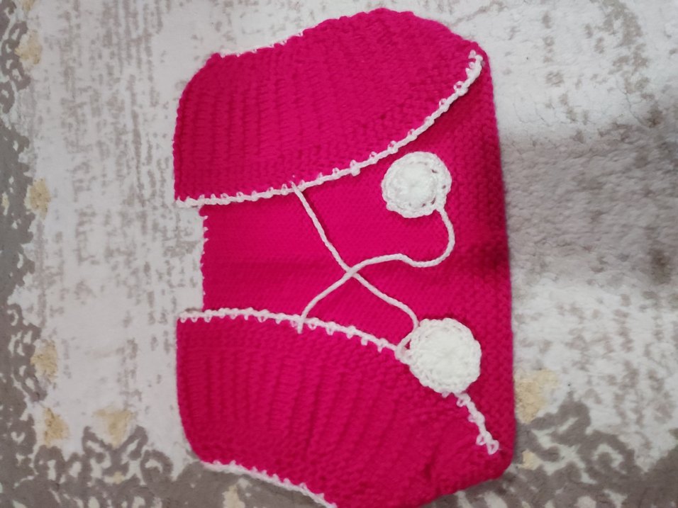 Nakışlı ve renkli detaylara sahip, pembe triko kız hırkasıdır. İp askılı ve beyaz süslemeleri vardır.