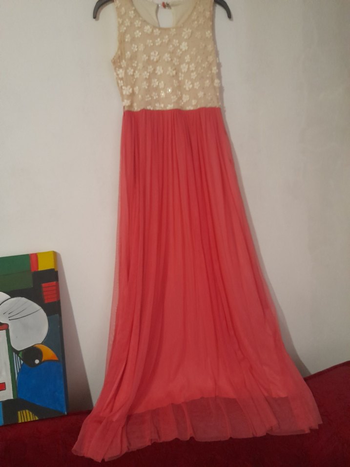 Nakışlı üst kısmı ve askısız straplez yaka detaylı, pembe uzun ve bol kesim elbise. Yumuşak sentetik kumaştan, bohem tarzda ve düğün gibi özel günler için uygundur.
