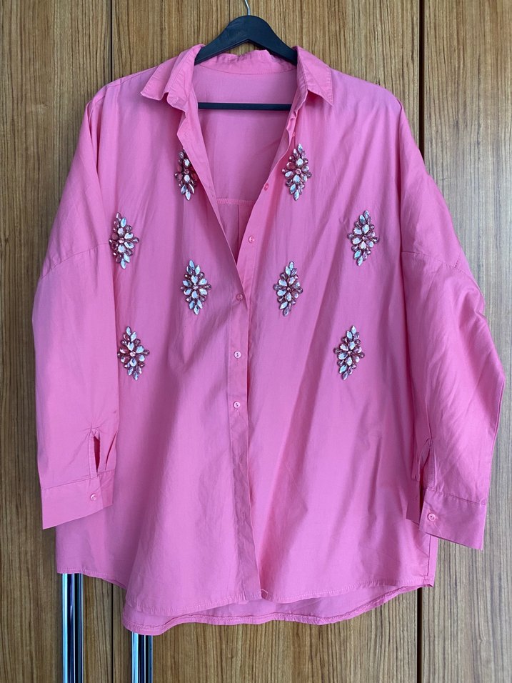 Uzun kollu, düğmeli, nakışlı desenlere sahip bol kesim pembe gömlek. Notlu yaka detayıyla günlük sokak stiline uygun.