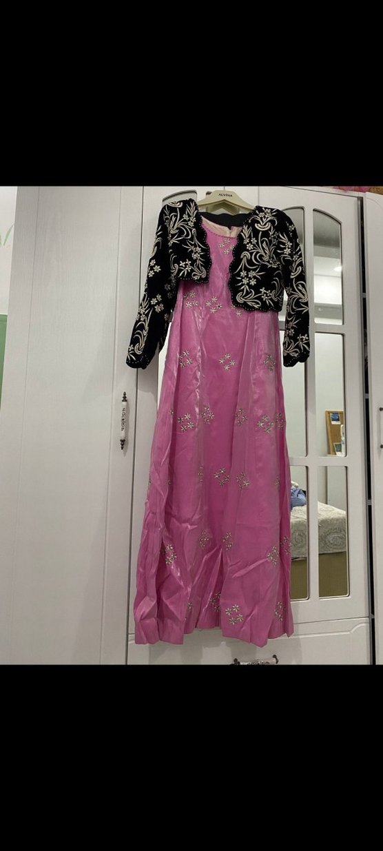Nakışlı desenlere sahip pembe uzun abiye elbise, siyah uzun kollu ceketle tamamlanmıştır. Özel dikimdir düğünler için uygundur.
