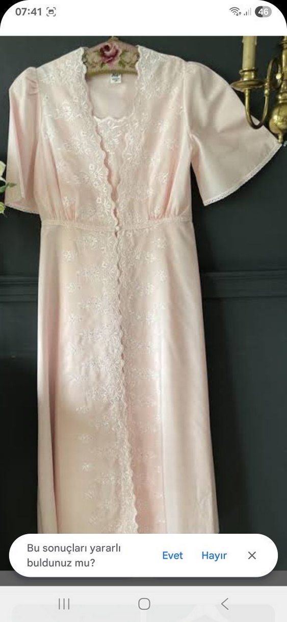 Uzun, pastel pembe renkte kısa kollu kadın sabahlığı, zarif nakış detaylarıyla vintage esintili ve normal kesimlidir.