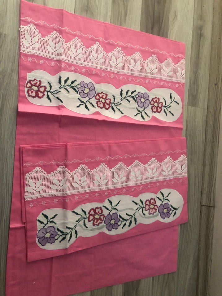 Nakışlı çiçek desenleri ve zarif dantel detaylarıyla pastel pembe yastık kılıfları. Yumuşak kumaş ve ince işçilik dikkat çekiyor.