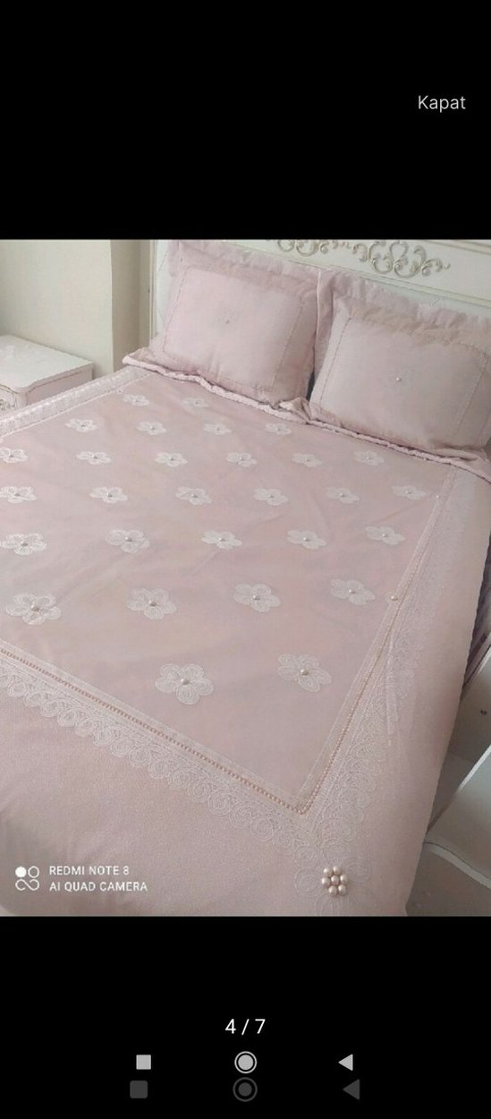 Pastel pembe renkte, nakışlı çiçek desenleri ve dantel detayları bulunan, yatak odasına zarif ve yumuşak bir dokunuş katan yatak örtüsü. hiç kullanmadım tertemiz bir ürün