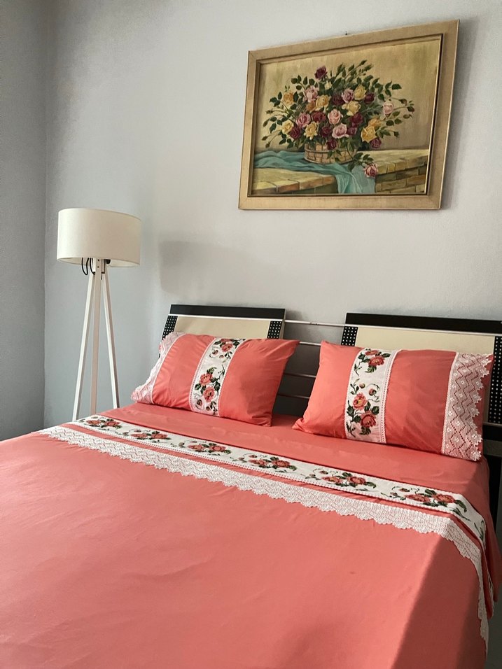 Pastel pembe renkte, nakışlı çiçek desenleri ve dantel detayları bulunan yatak örtüsü. İsteğe özel sipariş alınır