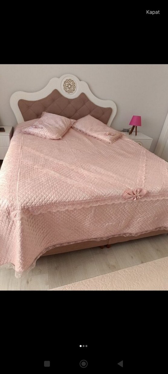 Nakışlı detaylara sahip pastel pembe yatak örtüsü ve uyumlu yastık kılıfları, yatak odasına zarif bir dokunuş katıyor. ️