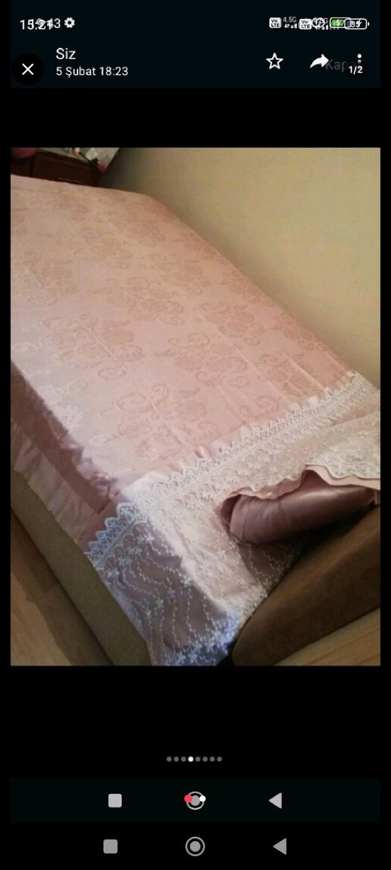 Pastel pembe renkte, nakışlı desenlere ve dantel süslemeye sahip yumuşak dokulu yatak örtüsü. çift kişiliktir herhangi fiyatı uygun tutuyorum çünkü ufak tefek kusurları mevcuttur