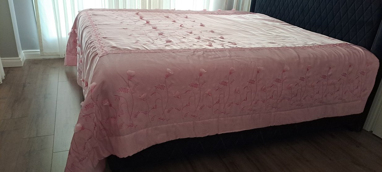 Pastel pembe renkte, zarif nakışlı çiçek desenleriyle yatak odasına yumuşak ve şık bir dokunuş sağlar. Sadece yastığın birinde ufak fazla belli olmuyor lekesi var yıkayınca çıkabilir.