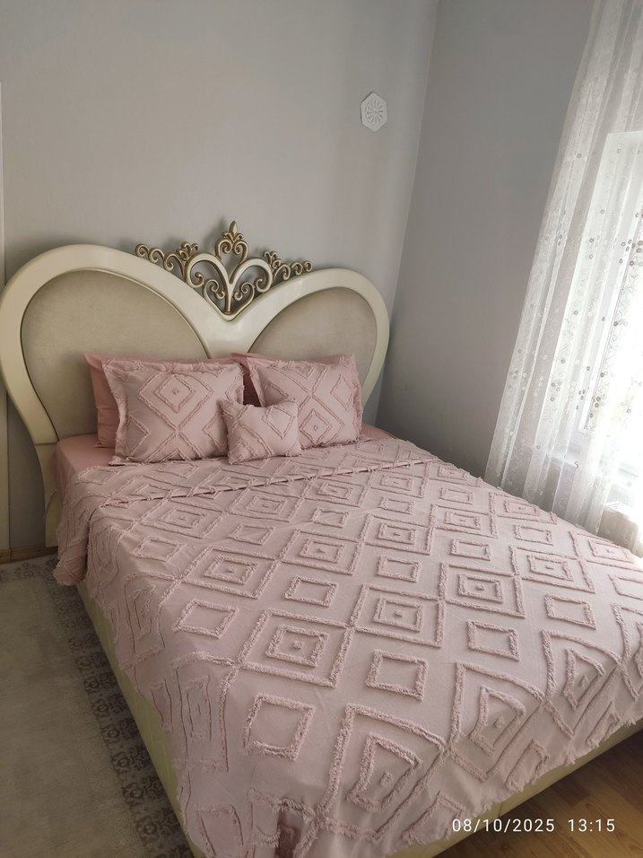 Pastel pembe renkte, nakışlı geometrik desenli yatak örtüsü. Yatak odasına yumuşak ve şık bir dokunuş katar. Yastıklarla uyumlu. 3 parçadan oluşmaktadır yatak örtüsü ve iki adet yastığı