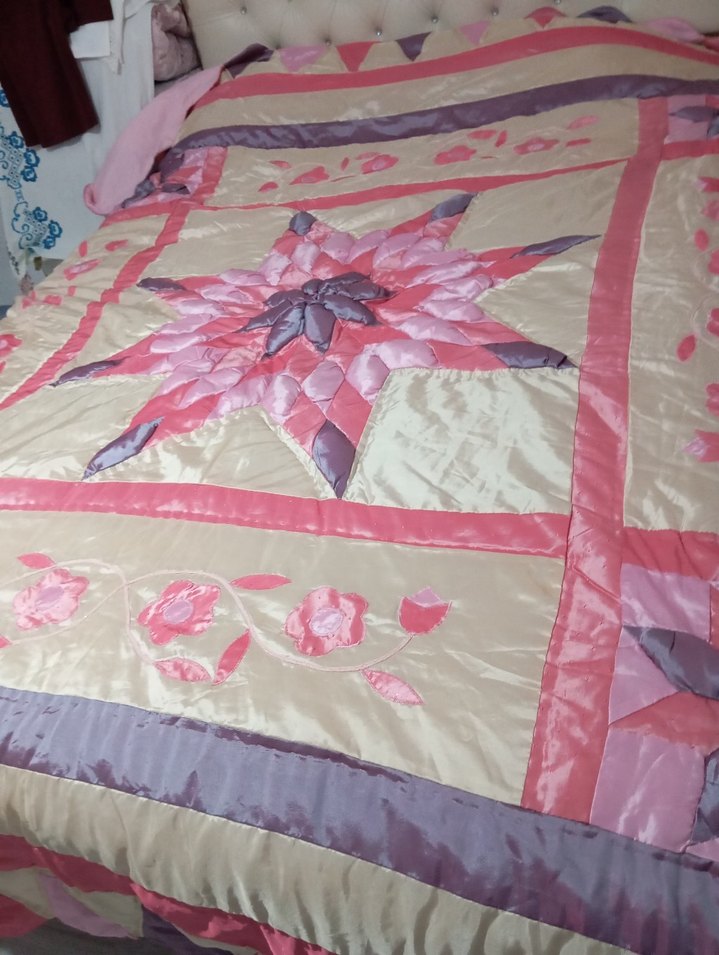 Nakışlı çiçek ve yıldız desenleriyle pastel pembe yatak örtüsü, yatak odasına yumuşaklık katar. 4 yama yatak örtüsü sfır ürün el ilgili az bi sökük var o yüzden fiyatı uygun tuttum