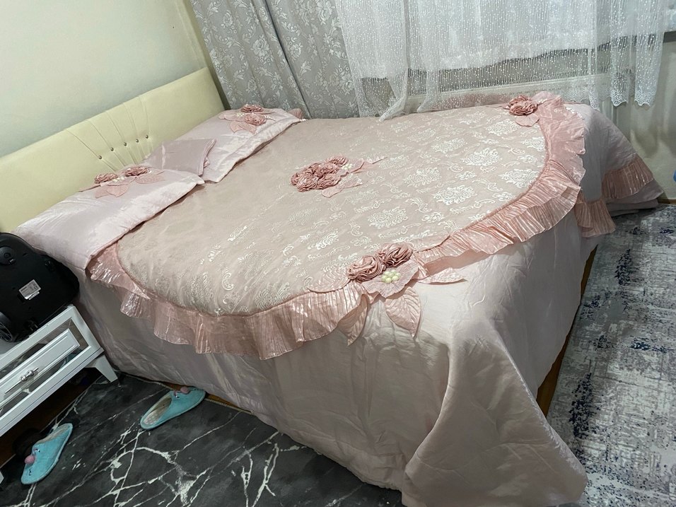 Nakışlı çiçek detayları ve fırfırlı kenarlarıyla pastel pembe yatak örtüsü, yatak odasına yumuşak ve zarif bir dokunuş katar.