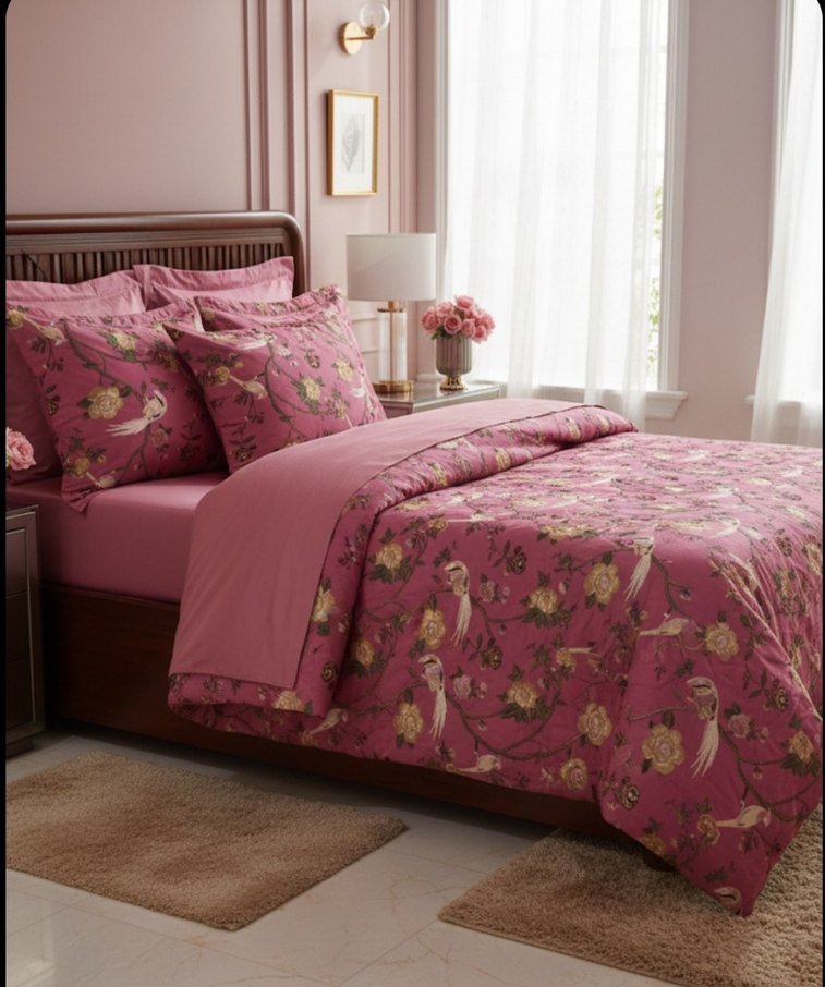Yumuşak kumaş üzerine işlenmiş çiçek ve kuş desenleriyle süslenmiş pembe yatak örtüsü, odaya zarif bir dokunuş katıyor. nakış işlemeli tek kişilik yurt dışından gelme eni 155 cm boyu 190 cm