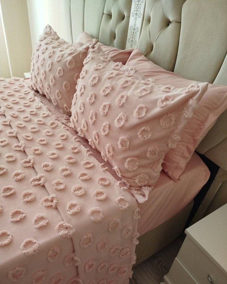 Nakışlı dairesel desenlere sahip pastel pembe yatak örtüsü, kumaşa zarif bir doku katıyor. Yumuşak ve dekoratif tasarım. Cift kisilik 3 parça yatak örtüsü 240×260cm Battal boy