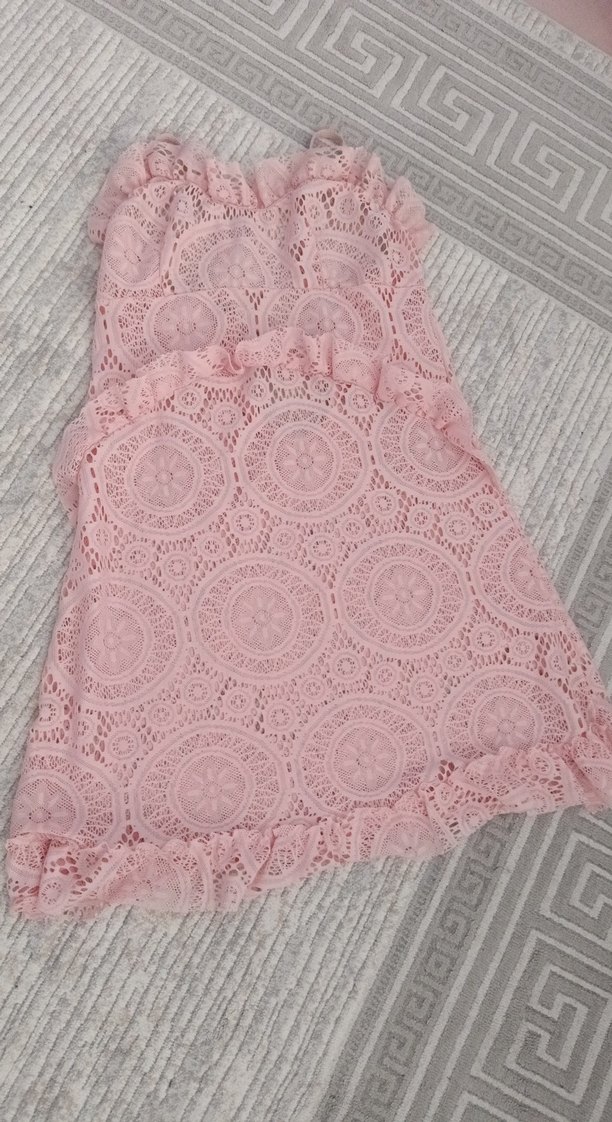 Pastel pembe renkte, nakışlı ve ince dairesel desenlere sahip yatak örtüsü, fırfır detaylarıyla zarif bir görünüm sunar.