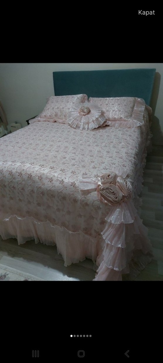 Pastel pembe renkte, nakışlı ve fırfırlı detaylara sahip yatak örtüsü. Uyumu sağlayan yastık kılıfları ve süs yastıkları ile tamamlanmıştır.