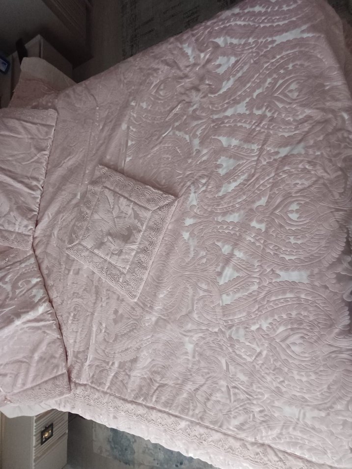 Pastel pembe renkte, zarif nakış desenlerine sahip yumuşak dokulu yatak örtüsü. Uyumu sağlayan yastık kılıfı da dahildir. ️