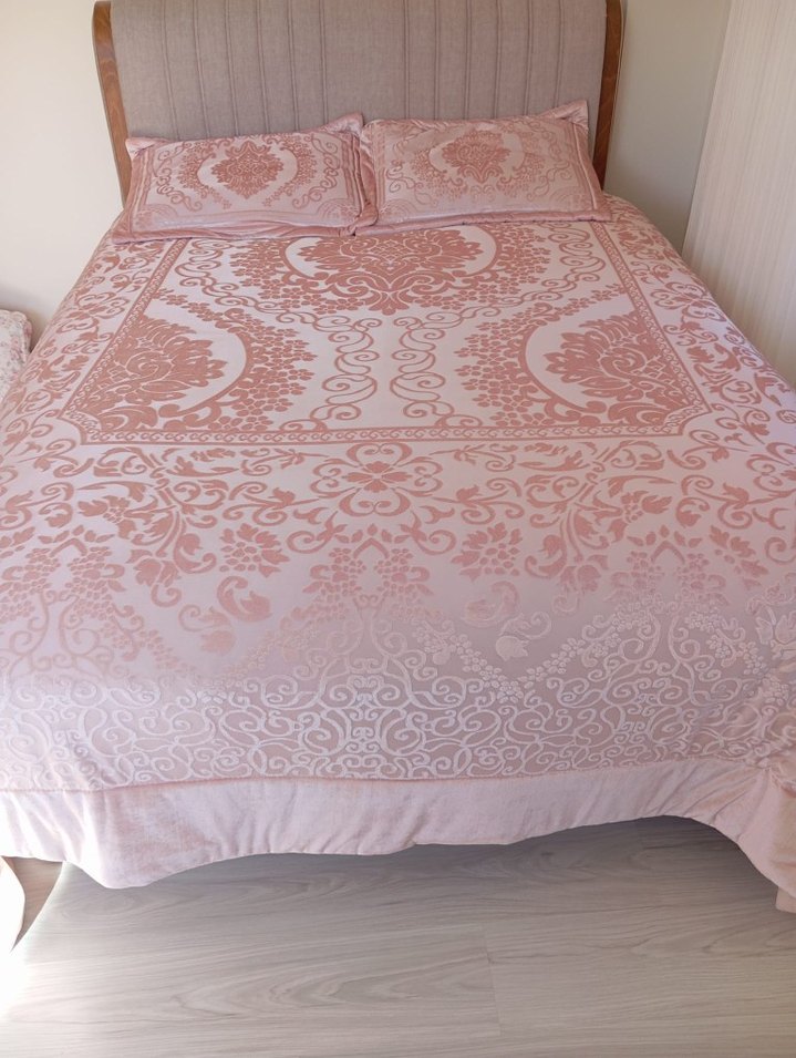 Nakışlı desenlere sahip pastel pembe yatak örtüsü, uyumlu yastık kılıfları ile yatak odasına zarif bir dokunuş katıyor.