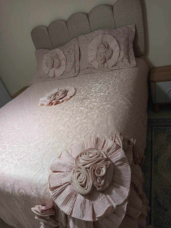 Nakışlı çiçek desenleri ve yastıklarla eteklerde fırfır detayları bulunan pastel pembe yatak örtüsü. Yumuşak ve zarif tasarım.