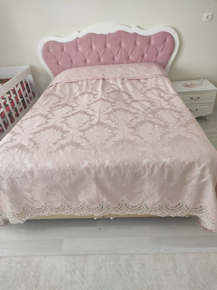Pastel pembe renkte, zarif nakış desenleriyle süslenmiş yatak örtüsü. Yumuşak ve dekoratif, yatak odasına şıklık katıyor. ️hiçbir sorunu yok tiftiklenme vesaire hiçbir sorunu yok tarz değişikliğinden dolayı satılıktır