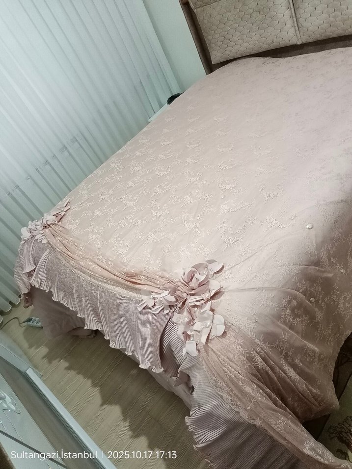 Pastel pembe renkte, nakış detaylı ve çiçek süslemeli yumuşak kumaştan yatak örtüsü.