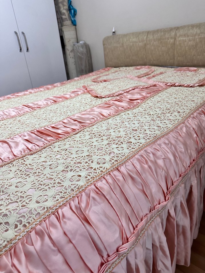 Pastel pembe renkli, nakış detaylı ve saten görünümlü pileli kumaşla yatak odasına zarif bir dokunuş katan yatak örtüsü.