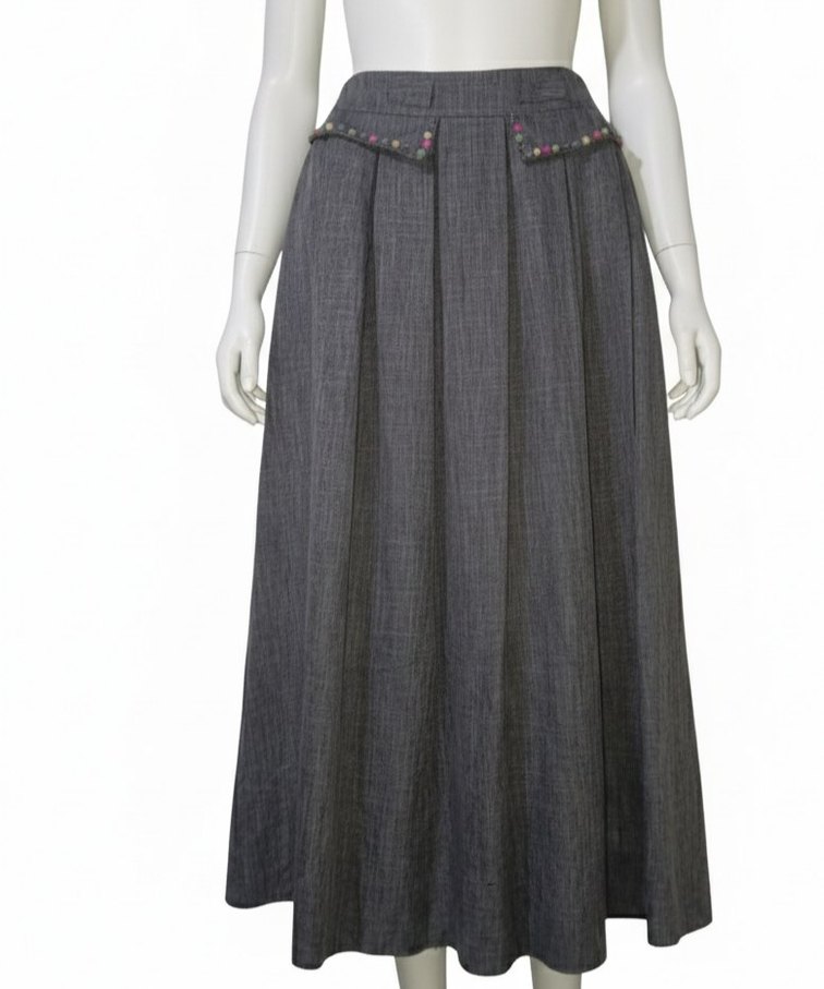 Yumuşak dokulu tekstil kumaştan yapılmış, nakışlı detaylar ve pilili tasarıma sahip uzun gri etek. Günlük kullanıma uygun bol kesim, vintage ve karşı kültür tarzında.