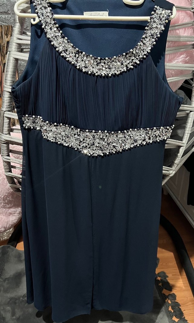 Lacivert renkte, pilili üst kısmı ve tekne yaka detayı olan, nakışlı uzun abiye elbise. Bel ve yaka çevresindeki işlemelerle modern klasik ve şık bir görünüm sunar.