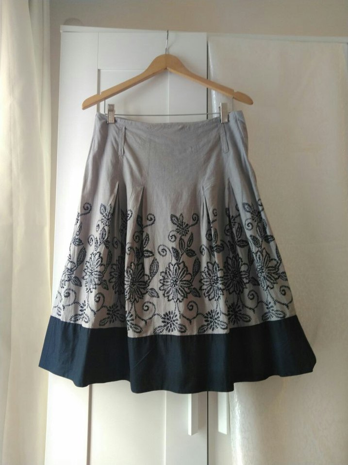 Gri renkte, pilili ve nakışlı çiçek desenli midi uzunlukta kadın eteği. Salaş kesim ve bohem vintage tarzı, günlük kullanım için uygundur. atmosfere marka yüzde yüz pamuk. astarlı. yazlık. İngiltereden alındı. 1-2 giyildi. bel 37 cm boy 63 cm.
