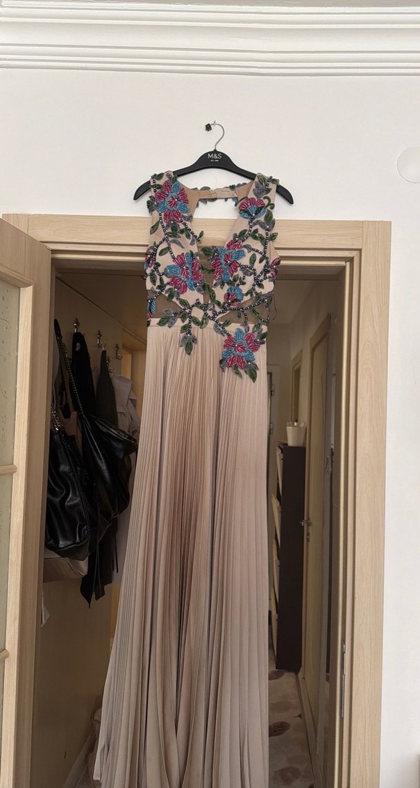 Kolsuz ve straplez, fit kesim üst kısmı renkli nakışlı çiçek desenleriyle süslü, uzun piliseli bej etekli abiye elbisedir. Düğünler ve bohem tarz için uygundur.