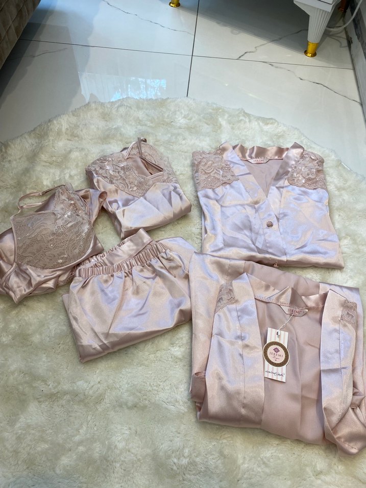 Nakışlı detaylara sahip, kısa kollu, pudra renkli, bol kesim kadın pijama takımı. Yumuşak ve rahat kumaştan, konforlu uyku için.